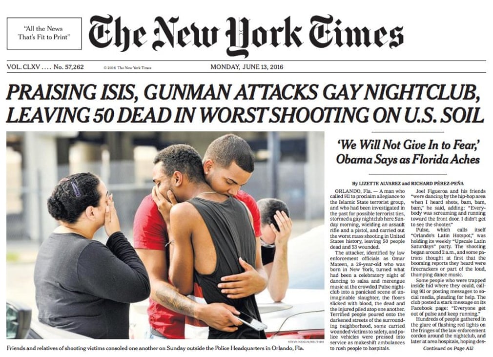 США, газета The New York Times: "Стрелок атаковал гей-клуб, застрелив 50 человек во славу ИГИЛа"