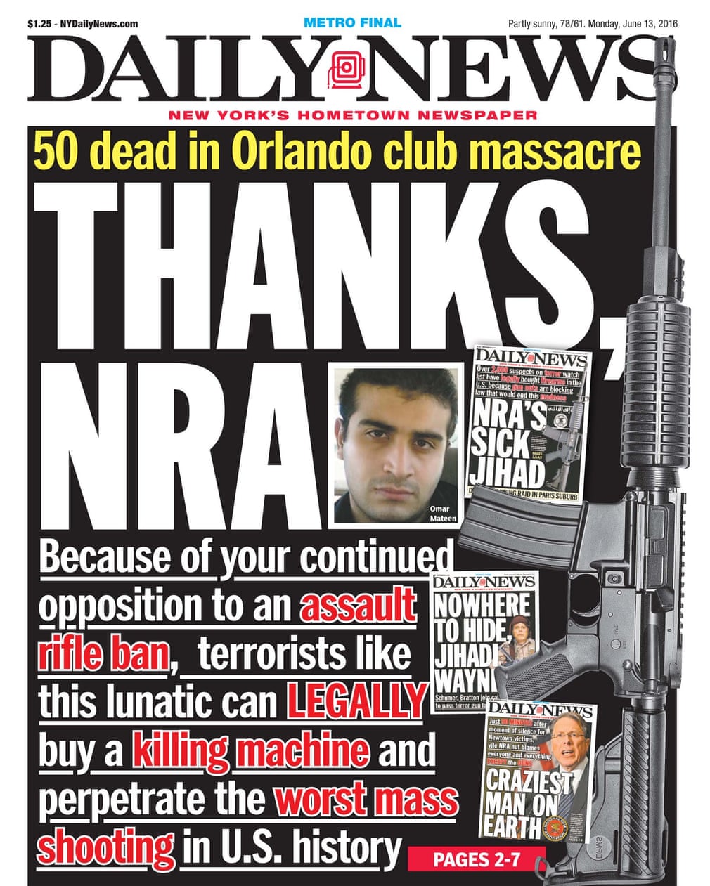США, газета The Daily News: "50 убитых в результате резни в клубе Орландо. Спасибо, НСА (Национальная Стрелковая Ассоциация)"