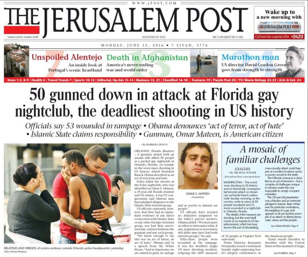 Израиль, газета The Jerusalem Post: "50 человек застрелены в результате атаки на гей-клуб во Флориде, самый кровавый расстрел в истории США"