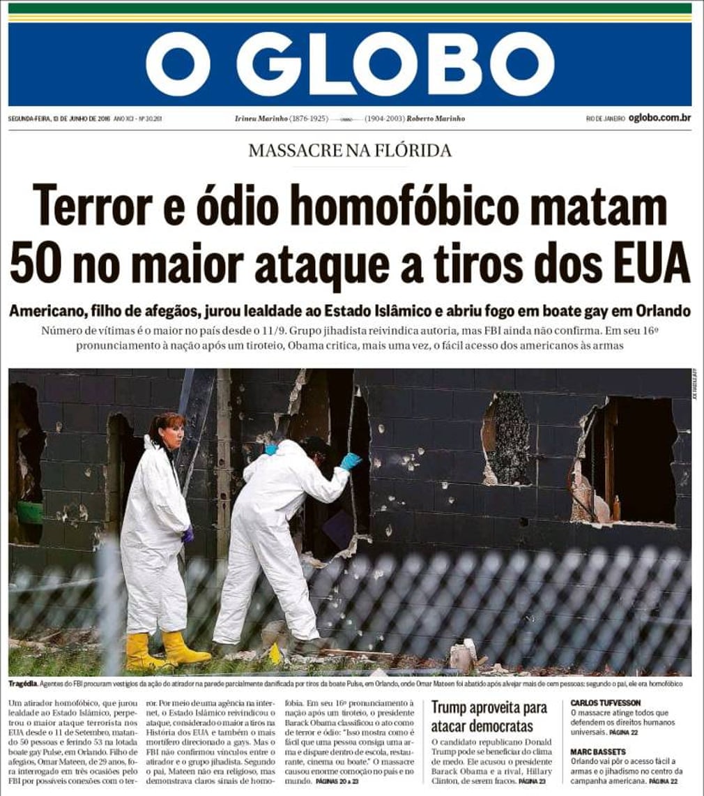 Бразилия, газета O Globo: "Террор на почве ненависти и гомофобии привел к смерти 50 человек в результате расстрела в США"