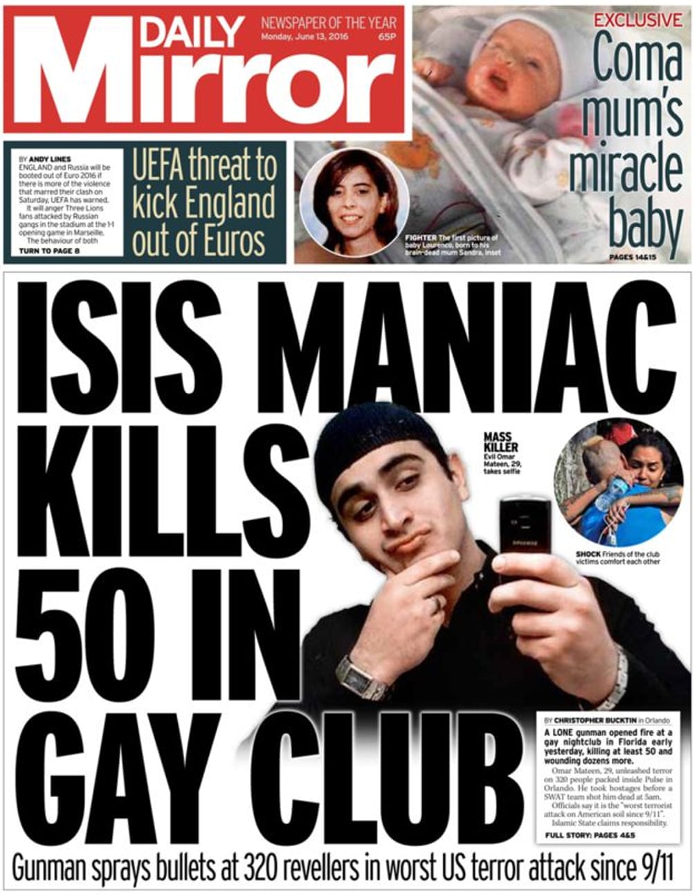 Великобритания, газета The Daily Mirror: "Маньяк из ИГИЛа убил 50 человек в гей-клубе"