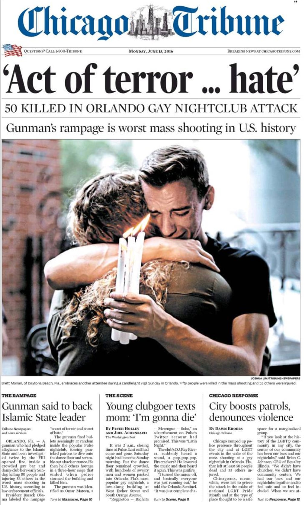 США, газета The Chicago Tribune: "Акт террора и ненависти: 50 человек убито из-за атаки на гей-клуб в Орландо"
